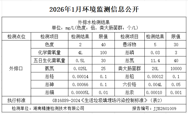湖南军信环保股份有限公司2026年1月环境监测信息公开